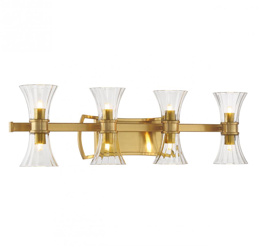 This Savoy House Bennington 8-light bath vanity light features pleasantly curving shapes that combine to create an intriguing lighting look. Fluted clear glass shades and thoughtful detailing on the structure, finished in warm brass, gives the impression of motion. Bennington is 8.75" in height, 32" in width and extends 6" from the wall. G9 LED bulbs are included.