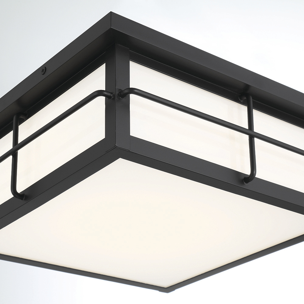 A delicate, rich black metal frame encases four opal glass panels, reminiscent of the shape of a bento box. This fixture emits a soft even glow for bright yet approachable illumination.
