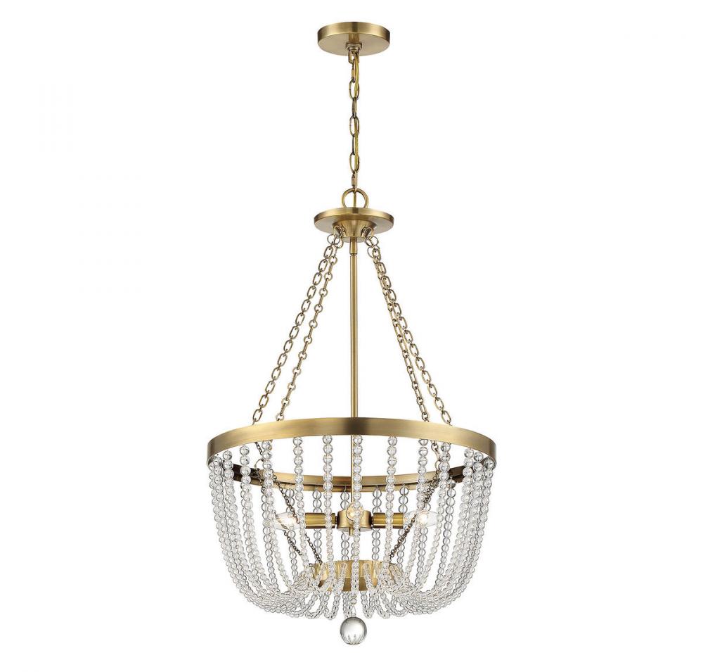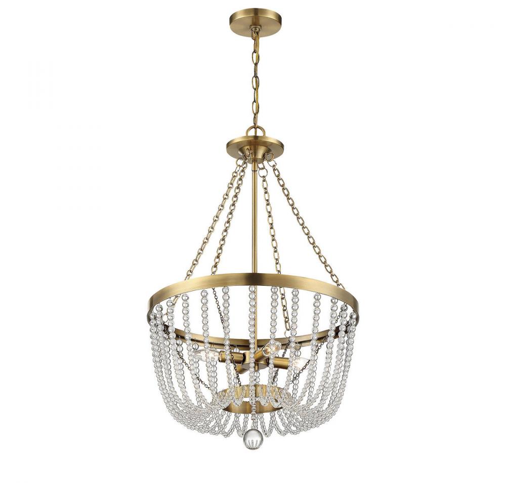 The glamorous Savoy House Bergamo 4-light pendant is smartly tailored, totally unfussy jewelry for your home. Adorned with rows of dramatically draped glass clear crystal orbs, finished in warm brass and topped off with a perfectly placed oversized bauble as a finial, Bergamo is truly a sight to behold. Perfect for adding a big touch of glamour to anywhere it hangs, from a kitchen to a bedroom, a living room to a closet. This fixture is 19.88" wide and 32.25" tall. Uses 4 candelabra-size light bulbs of up to 60 watts each (not included).