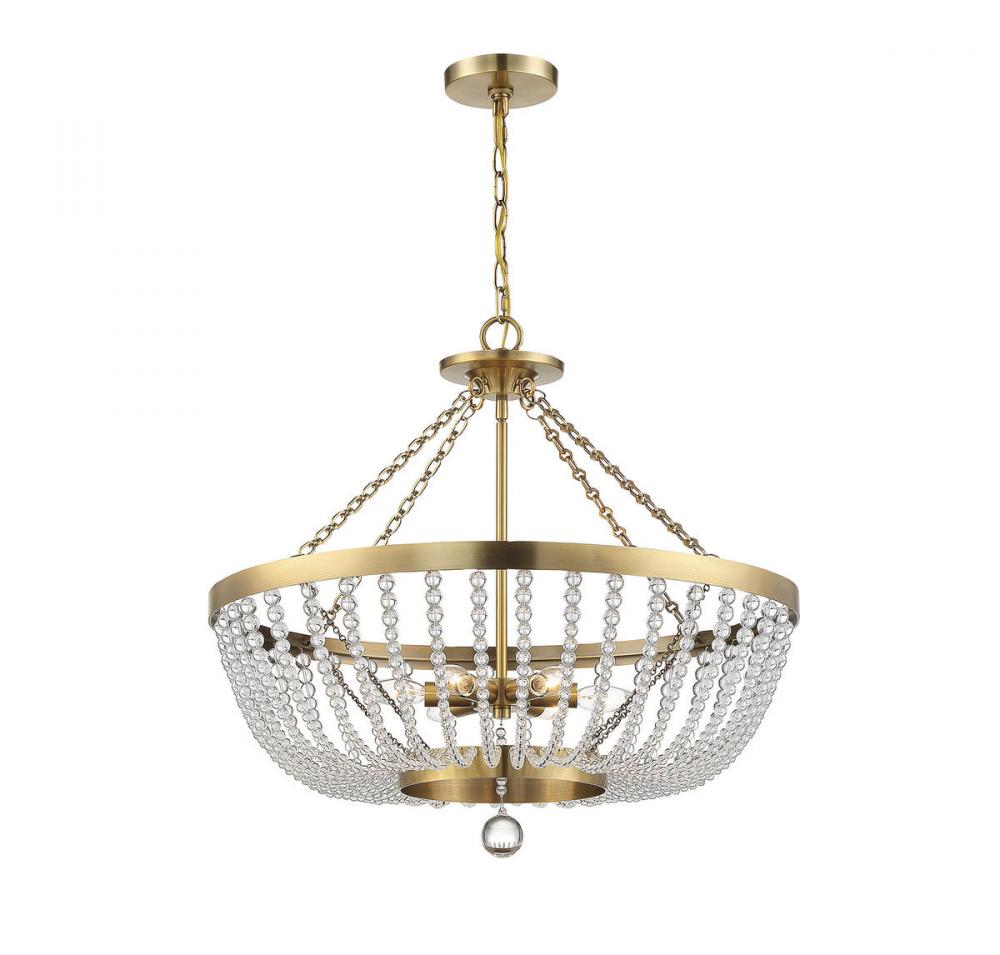 The glamorous Savoy House Bergamo 6-light pendant is smartly tailored, totally unfussy jewelry for your home. Adorned with rows of dramatically draped clear crystal orbs, finished in warm brass and topped off with a perfectly placed oversized bauble as a finial, Bergamo is truly a sight to behold. Perfect for adding a big touch of glamour to anywhere it hangs, from a kitchen to a bedroom, a living room to a closet. This fixture is 26" wide and 23.5" tall. Uses 6 candelabra-size light bulbs of up to 60 watts each (not included).