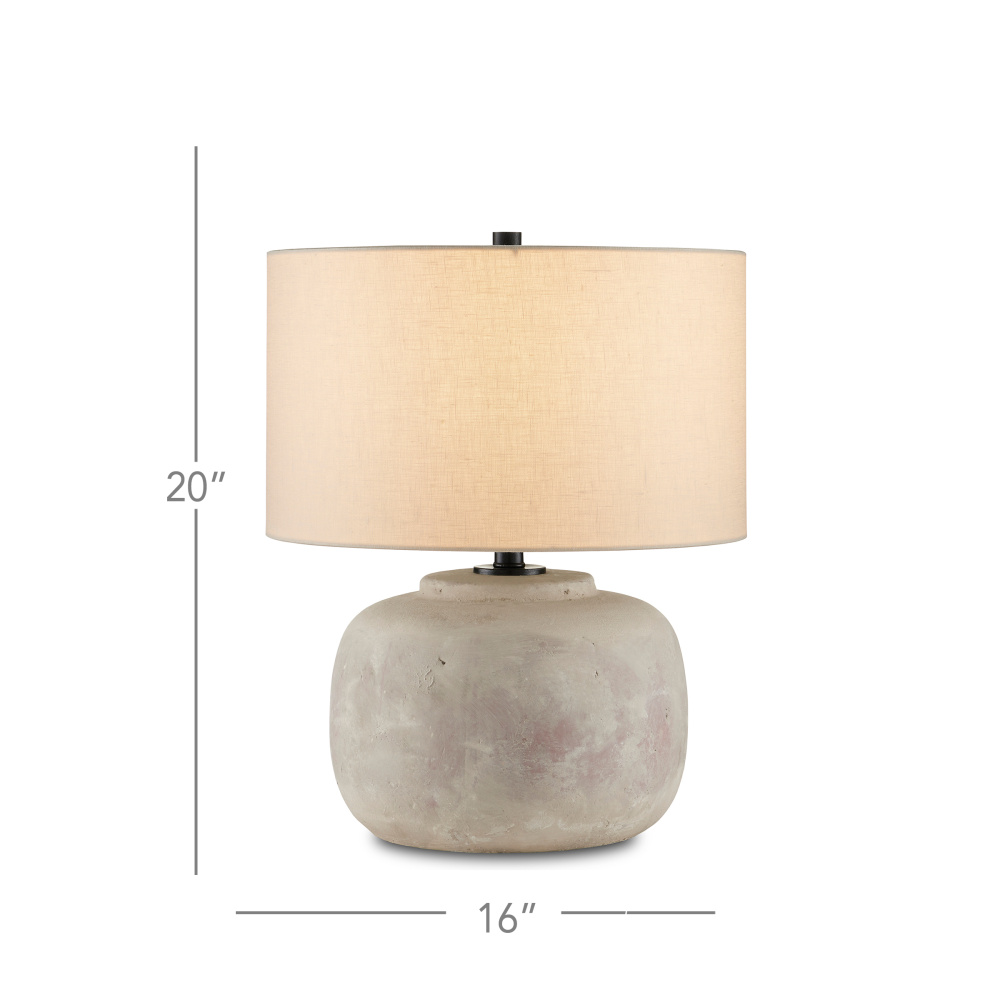 The Beton Table Lamp has a distressed finish on its concrete body aptly named antique earth. This is one of our products that illustrates the talented finish artisans who make our new products look beautifully aged. We've topped this buxom distressed gray lamp with a light beige linen shade.