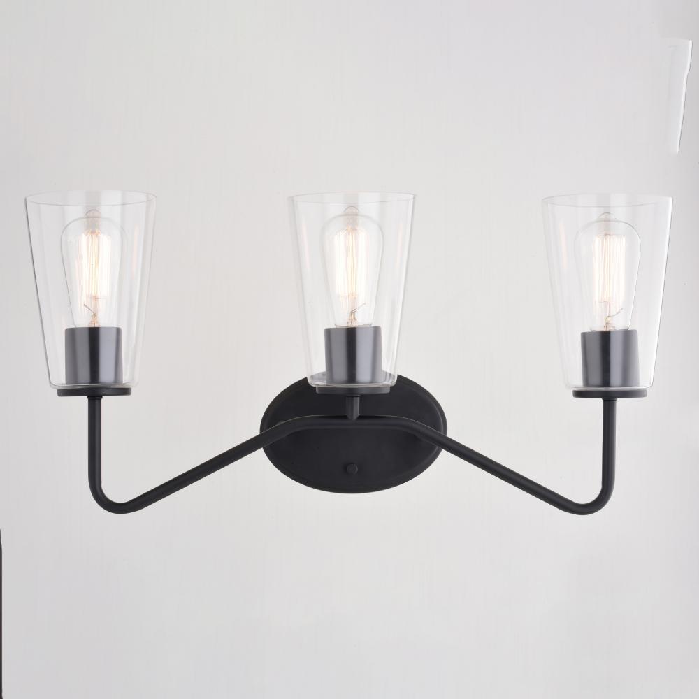 The Beverly collection provides a modern take on classic elegance. Uniquely curved arms in a matte black finish support clear tapered glass strongly anchored in place. Round matte black discs hold the glass creating a gentle, inviting aesthetic. This bathroom light is perfect over medium vanities or as a pair over double sinks. Add this versatile 3 light vanity to any bathroom for the ultimate addition of transitional style.