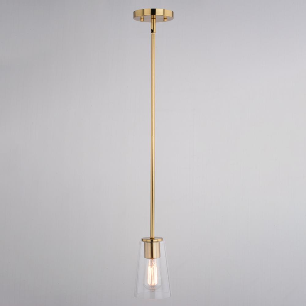 The Beverly collection provides a modern take on classic elegance. A muted brass finish supports clear tapered glass strongly anchored in place. Round muted brass discs hold the glass creating a gentle, inviting aesthetic. Add this versatile 1 light pendant in groups above any kitchen island or dining area for the ultimate addition of transitional style.