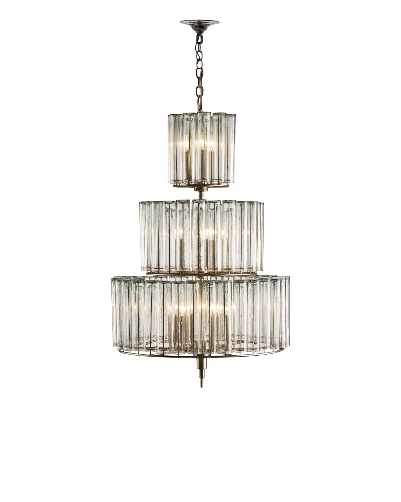 The medium version of the Bevilacqua Chandelier is a magnificent toast to good taste. Filled with luminosity and grace, its three tiers of reflective glass flutes are made from recycled bud vases. Its wrought iron frame is finished in an exquisite silver leaf that compliments the hues in the glass. This 12-light chandelier with its ascending architecture is one in a variety of fixtures in the Bevilacqua collection.
