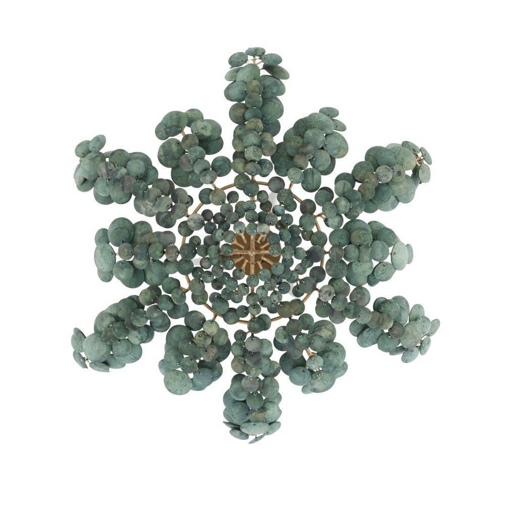 The lush allure of tropical foliage informs the Bilal. From afar, this botanically inspired fixture resembles metal but is cleverly made of sustainable coconut shell in a rich eucalyptus hue inspired by succulent plants. A stylish companion to our Bilal chandelier, it is suspended from an antique brass-plated iron canopy. Finish will vary.