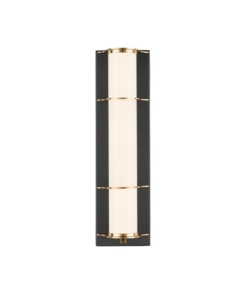 The Blaine Bronze Bath Wall Sconce has a tubular design, with a milky glass tube set into the metal rings in a polished brass finish that contrast the wallplate in an oil-rubbed bronze finish. Perfect for lighting up a bathroom vanity, the Blaine has a simple design that will work well within a number of design styles.