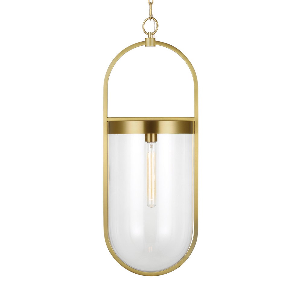 The Blaine one light indoor pendant in burnished brass Chapman & Myers is a simple modern interpretation of a classic glass smoke bell lantern. Each pendant is suspended from a unique oval frame which is circumscribed around an inner glass shade. The glass is held in place by a banded metal collar at the top and lit from within with a single filament bulb.