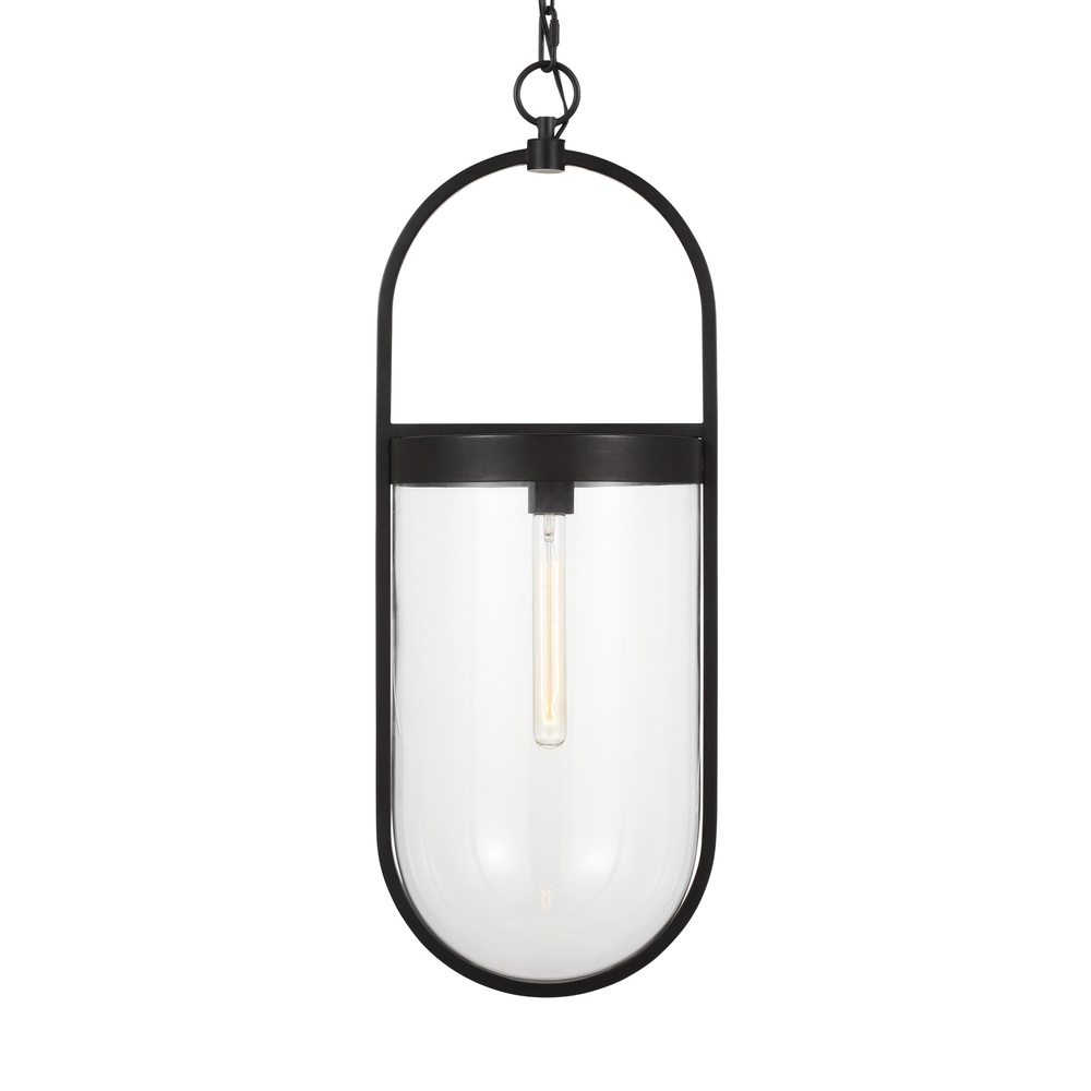 The Blaine one light indoor pendant in aged iron by Chapman & Myers is a simple modern interpretation of a classic glass smoke bell lantern. Each pendant is suspended from a unique oval frame which is circumscribed around an inner glass shade. The glass is held in place by a banded metal collar at the top and lit from within with a single filament bulb.