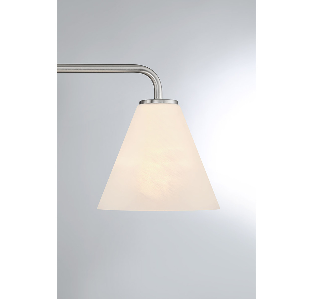 Get a warm and welcoming glow at the vanity with the Savoy House Blair 3-light bath light. Conical shades of white strie glass feature eye-catching wisps and swirls that add a touch of dimension and intrigue. The glass contrasts nicely with the versatile Satin Nickel finish. Blair is 8" in height, 25.5" in width and extends 8.5" from the wall. Uses three standard size bulbs of up to 60 watts per bulb. Bulbs not included. This bath light is damp area rated and may be installed with the glass facing up or down.