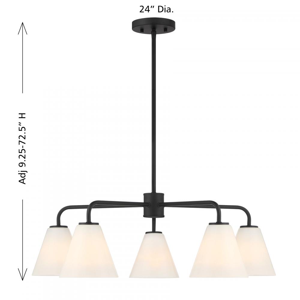 This Savoy House Blair 5-light chandelier is oh so versatile! It can be installed with the lights facing up or down, making it perfect for meeting every lighting need. Slender, sleek arms are finished in Matte Black and topped with shades of spectacularly swirling strie glass. Blair is 30" in width and has an adjustable height ranging from 9.25" to 63.25". Uses five standard size bulbs of up to 60 watts per bulb. Bulbs not included. Comes with four 12" downrods and one 6" downrod.