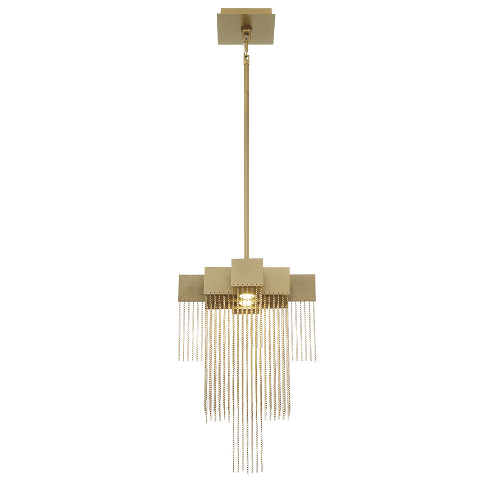 A lustrous collection of delicate, high-gloss metal chains cascade like gleaming streams of water in this transitional piece. Resembling armored chain mail, the polished, plated mesh envelops each integrated LED light to add a soft, shimmering glow.