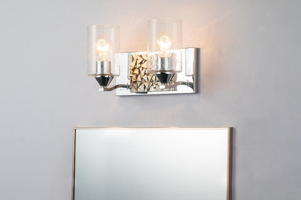 A 13" x 8" x 6.5" 2-light vanity in polished chrome and antique silver with a textured backplate and cylinder seeded glass. Brings contemporary texture to bathrooms.