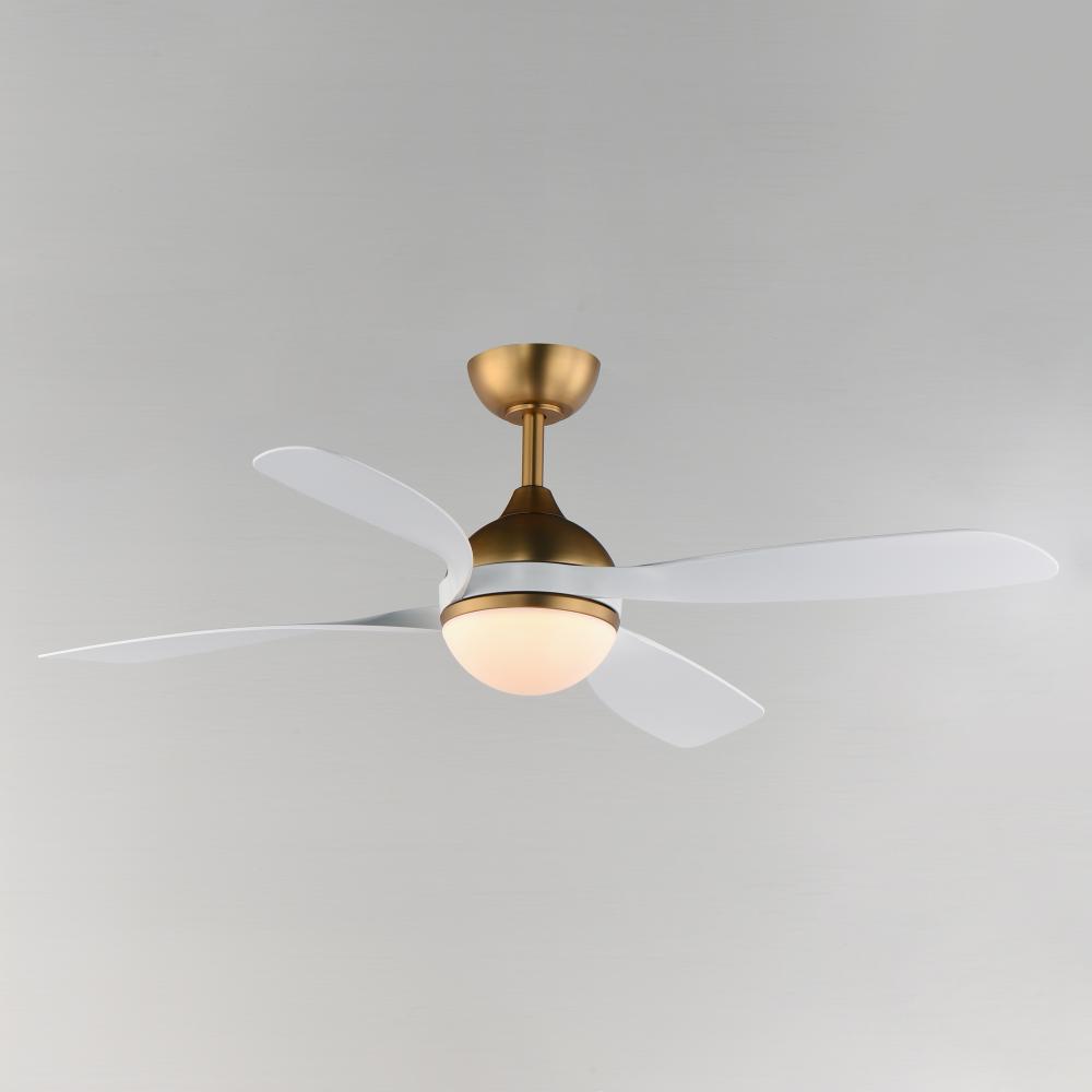 Modern and chic, the Bola collection elevates the standard fan with its beautifully balanced design. A sleek globe frame seamlessly separates the top DC motor housing from the lower LED light kit, while gracefully curved solid wood blades add a touch of na