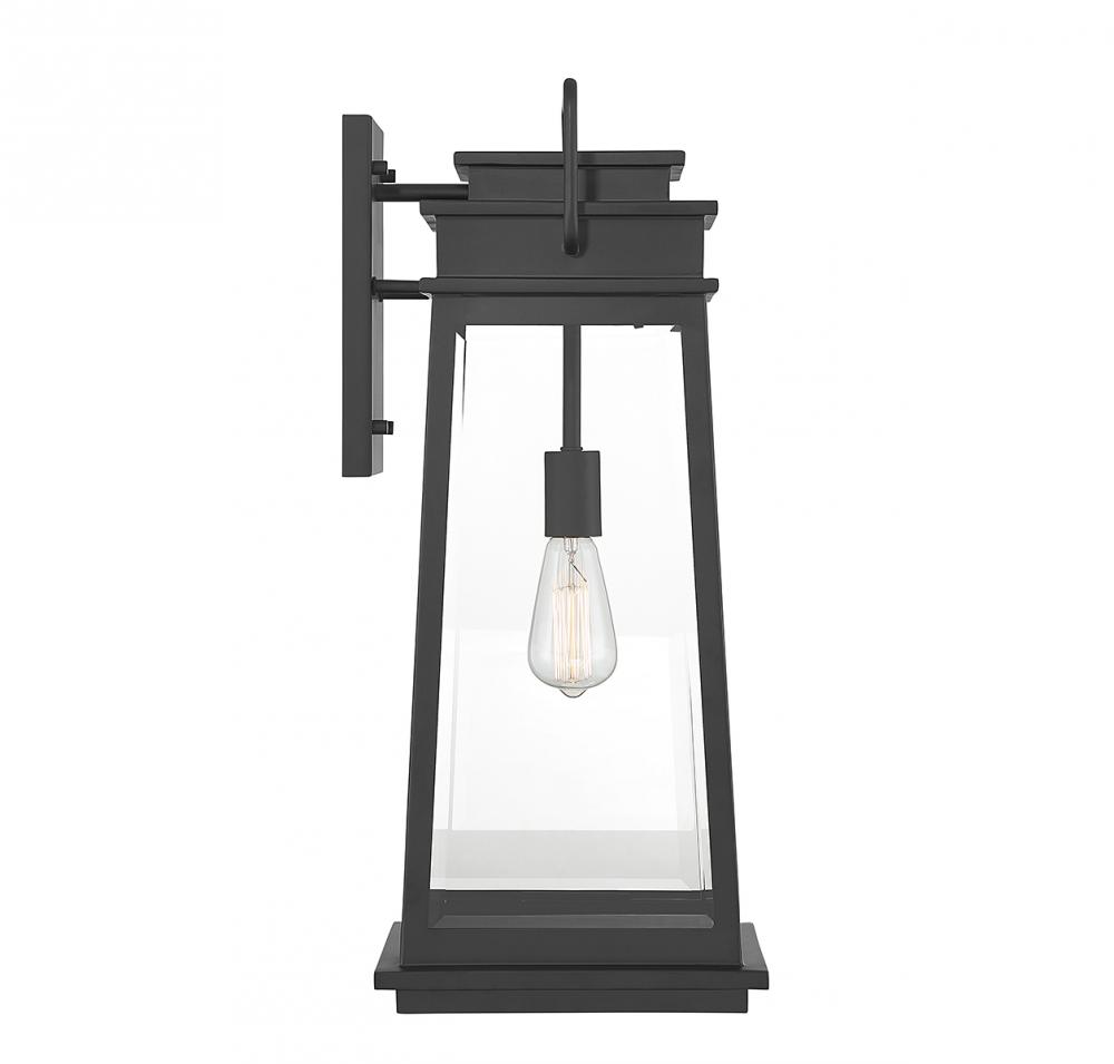 The Savoy House Boone 1-light outdoor wall light showcases a classic lantern-style lighting look with panes of clear beveled glass and a matte black finish that adds versatility. Boone is 24.75" in height, 10.25" in width and extends 11.5" from the wall. It uses 1 standard size bulb with a max of 60 watts (bulb not included).