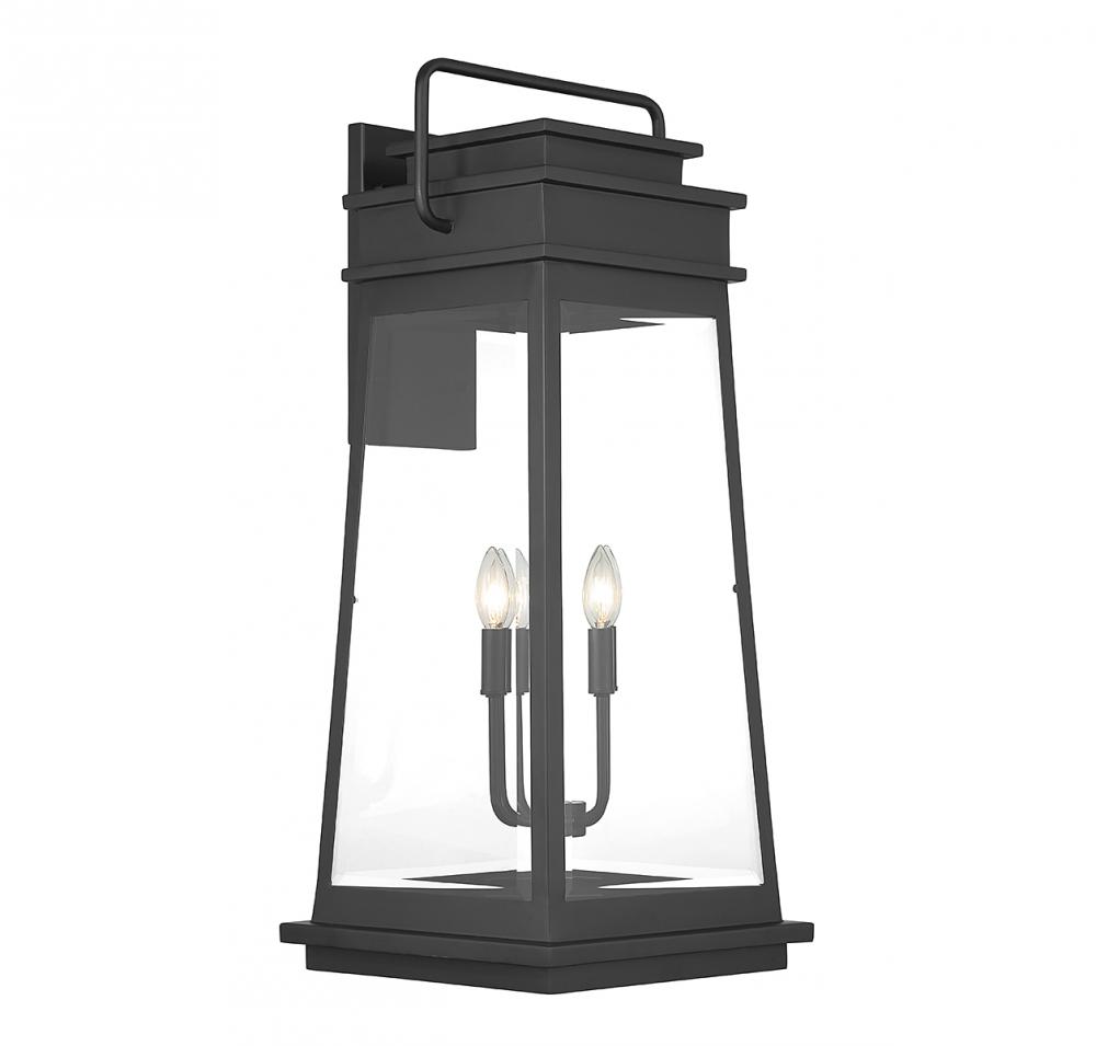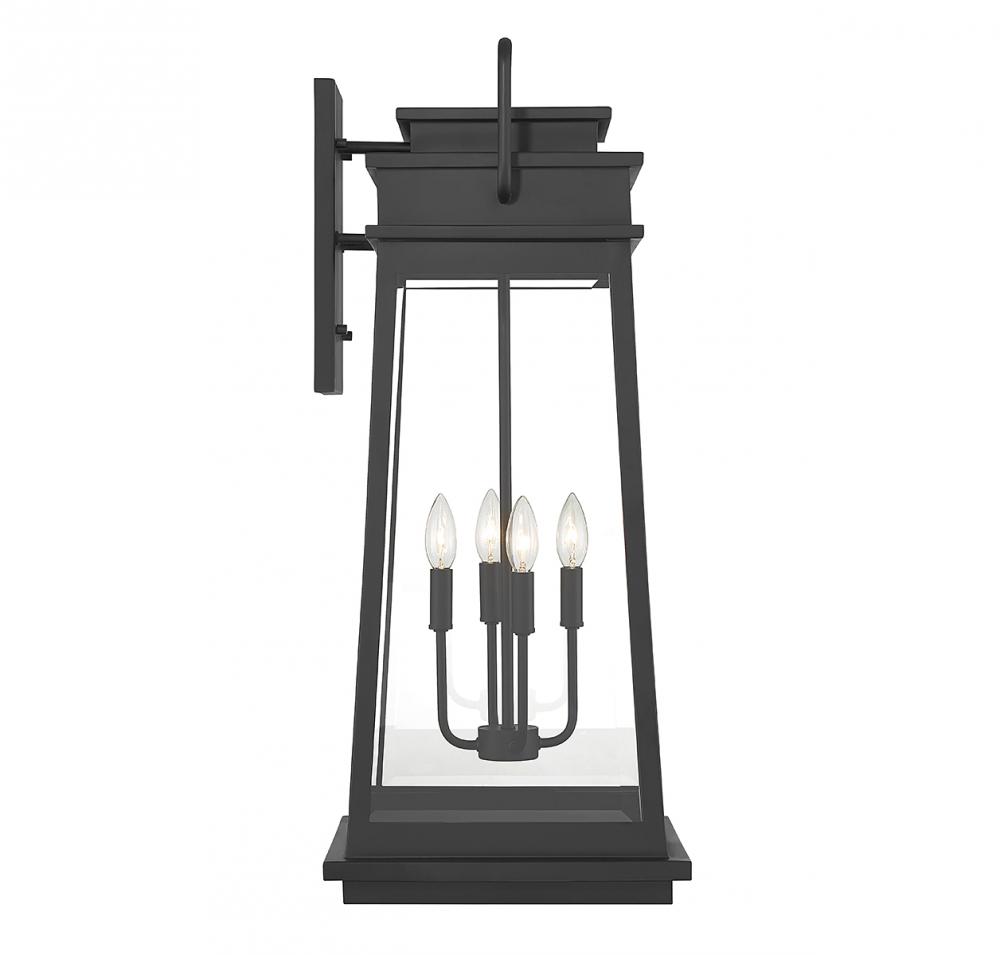 The Savoy House Boone 4-light outdoor wall light showcases a classic lantern-style lighting look with panes of clear beveled glass and a matte black finish that adds versatility. Boone is 32" in height, 13.25" in width and extends 13.5" from the wall. It uses 4 candelabra size bulbs with a max of 60 watts per bulb (bulbs not included).