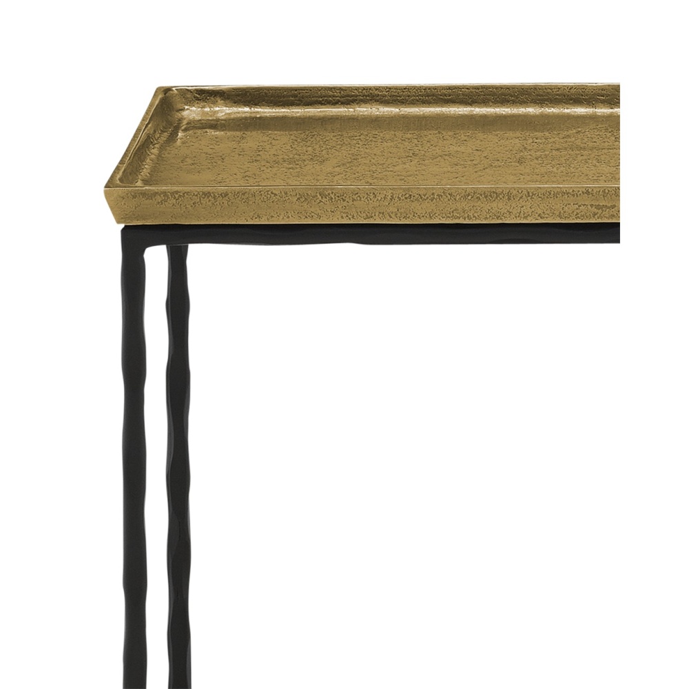 The Boyles Brass Side Table has a simple forged iron base in a black iron finish holding an antique brass tray-like top. This side table is an expressive piece of furniture for any spot where an accent table is needed.