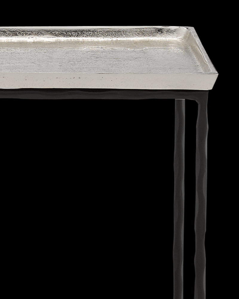 The Boyles Silver Side Table has a simple forged iron base in a black iron finish holding an antique silver tray-like top. This side table is an expressive piece of furniture for any spot where an accent table is needed.