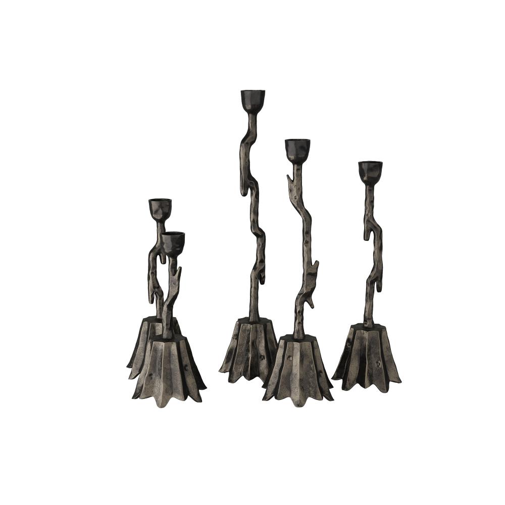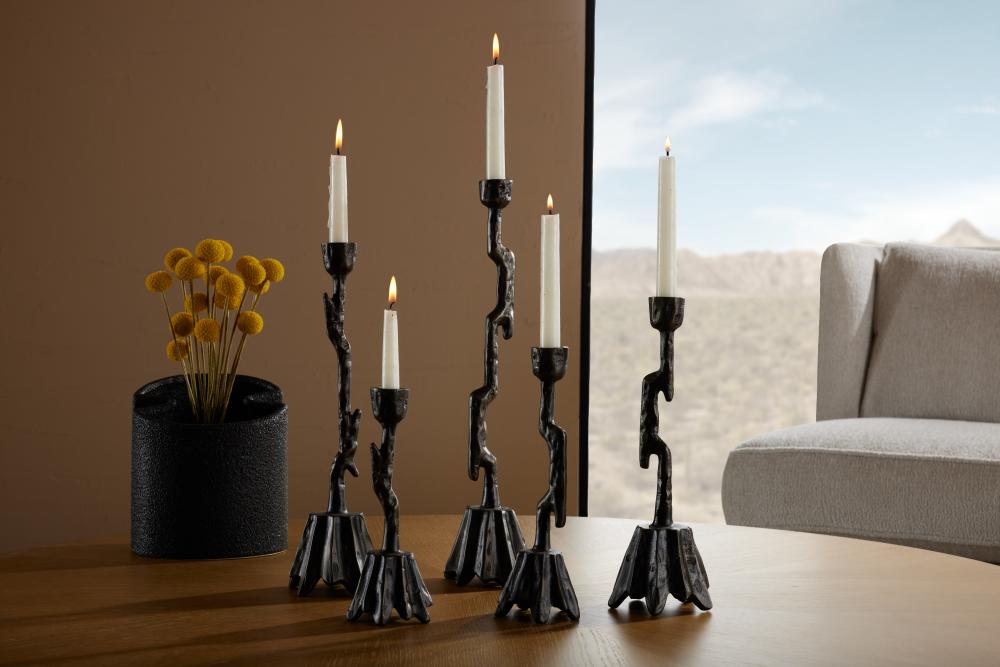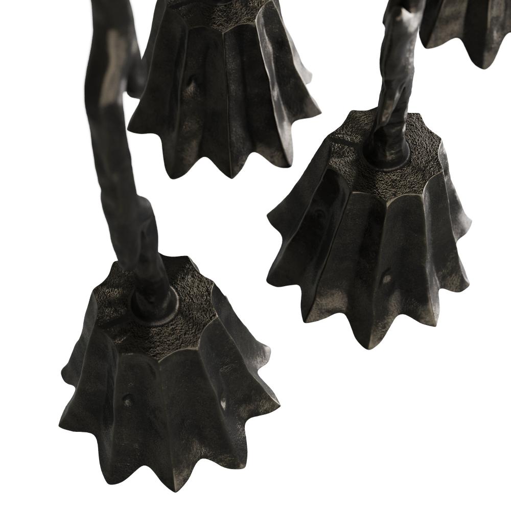 A quintet of Brutalist candlesticks adds an edge to any surface. Finished in bronze, these cast aluminum organically inspired sculptural accents are staggered in height to intrigue the eye. Fluted at the base, each is designed to hold a taper candle.