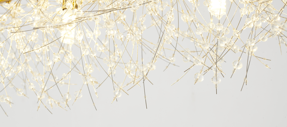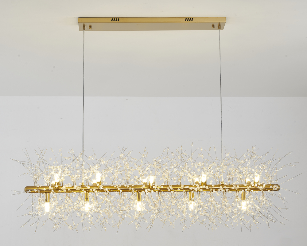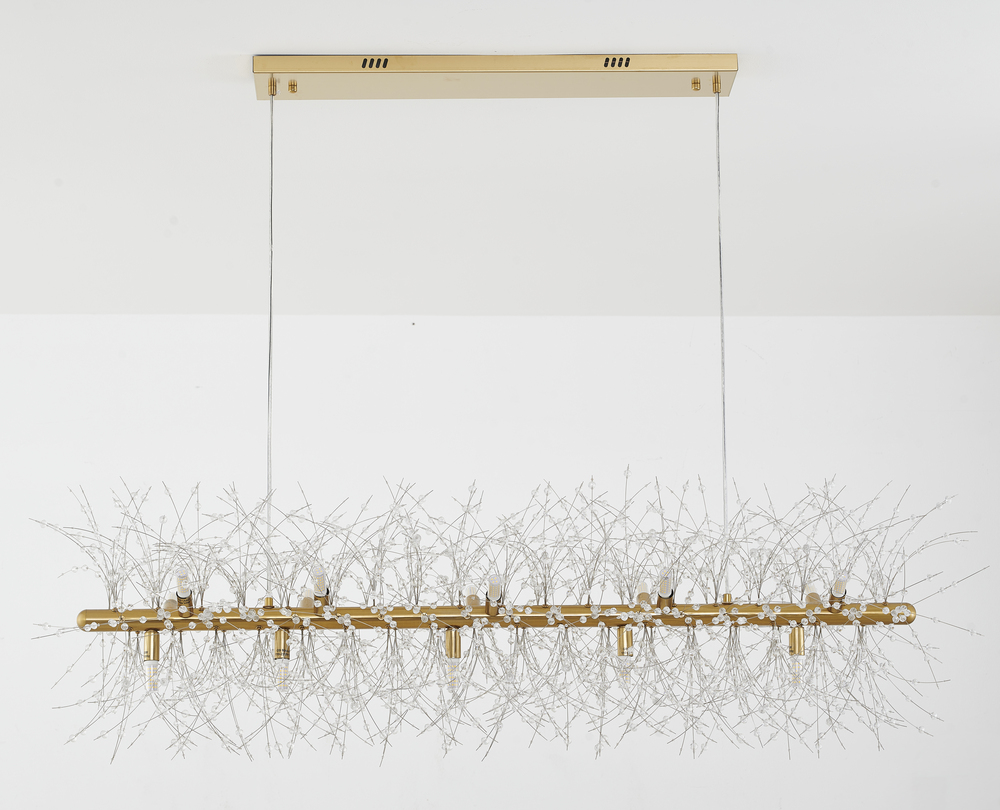 This chandelier is a brass linear frame chandelier. It comes with clear crystal spike accents. The cord length of 78 inches and the cord length is provided.