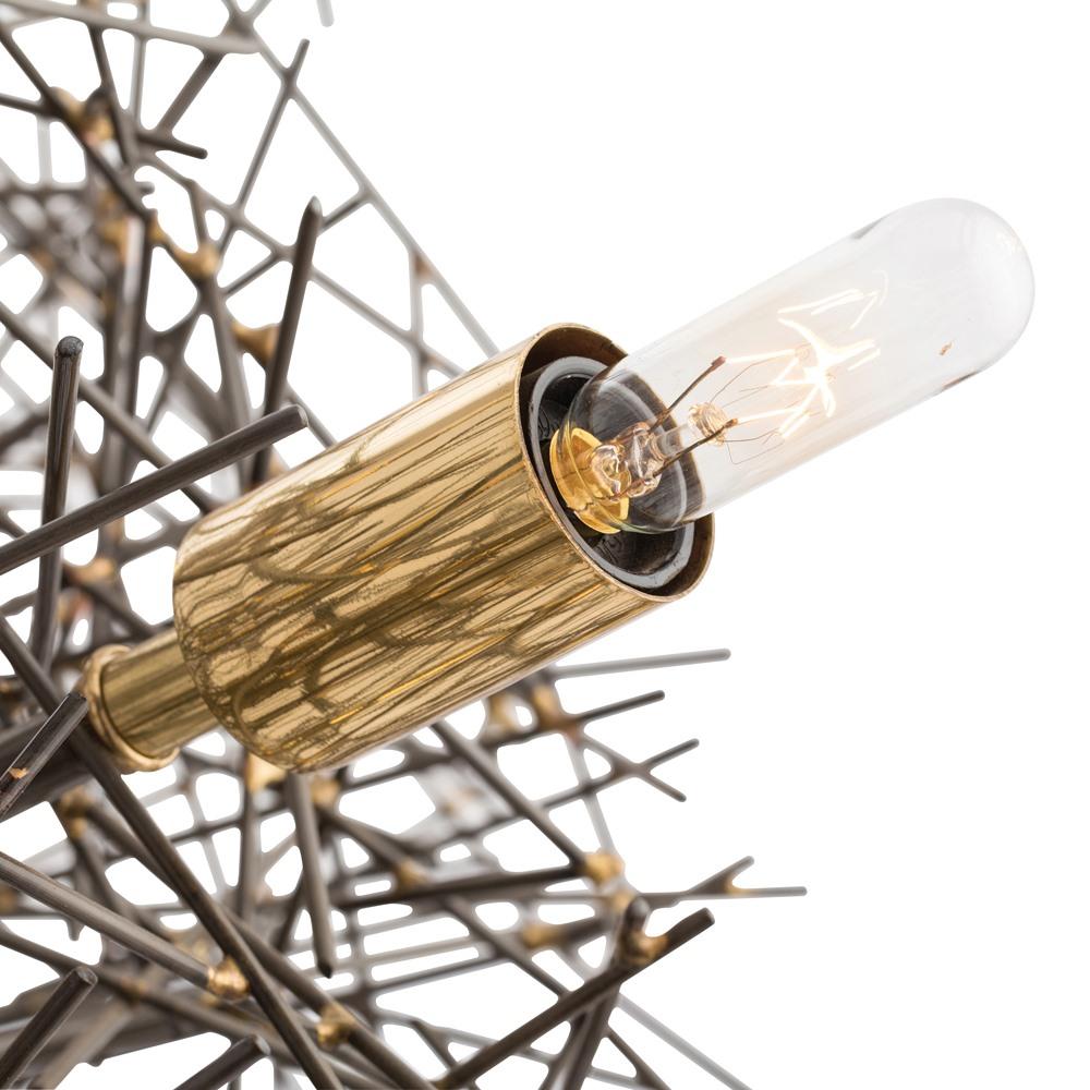 Bold and brazen this 12-light chandelier pays homage to our Texas roots and the humble tumbleweed. Sharp pieces of natural iron have been hand-welded into a graphic sphere that is beautifully chaotic.Subtle brass welds add a bit of polish. Shown with small clear tubular bulbs. Brass welds will vary in color and size. Additional chain available CHN-116.