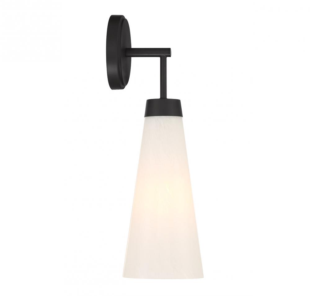 The Brevard 1-light sconce brings a beautiful glow with a tall conical shade of strie glass and a Matte Black finish. The strie glass shade features ethereal wisps that add extra intrigue and beauty, whether the light is on or off. Brevard is 17.75" in height, 5.5" in width and extends 6" from the wall. Uses one standard size bulb of up to 60 watts. Bulb not included.