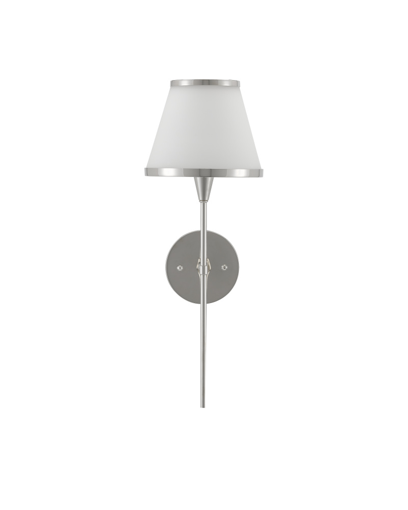 Pencil thin with a stylish trim on its opaque glass shade, the Brimsley Nickel Wall Sconce is brimming with tailored sophistication. The silver wall sconce is made of metal in a polished nickel finish, the sheen of the polished surfaces gleaming as brightly as the crisp white glass on the shade. The Brimsley is also available in antique brass and oil-rubbed bronze finishes, all three sconces certified for damp locations. Part of the Bagno Collection of wall sconces designed for bathroom spaces.