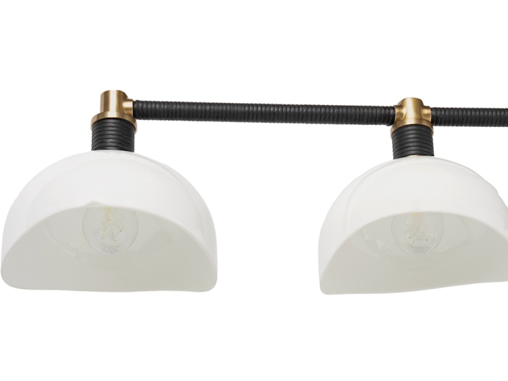Chandelier features white milk glass shades accented with antique brass details and hand-wrapped black finished cane