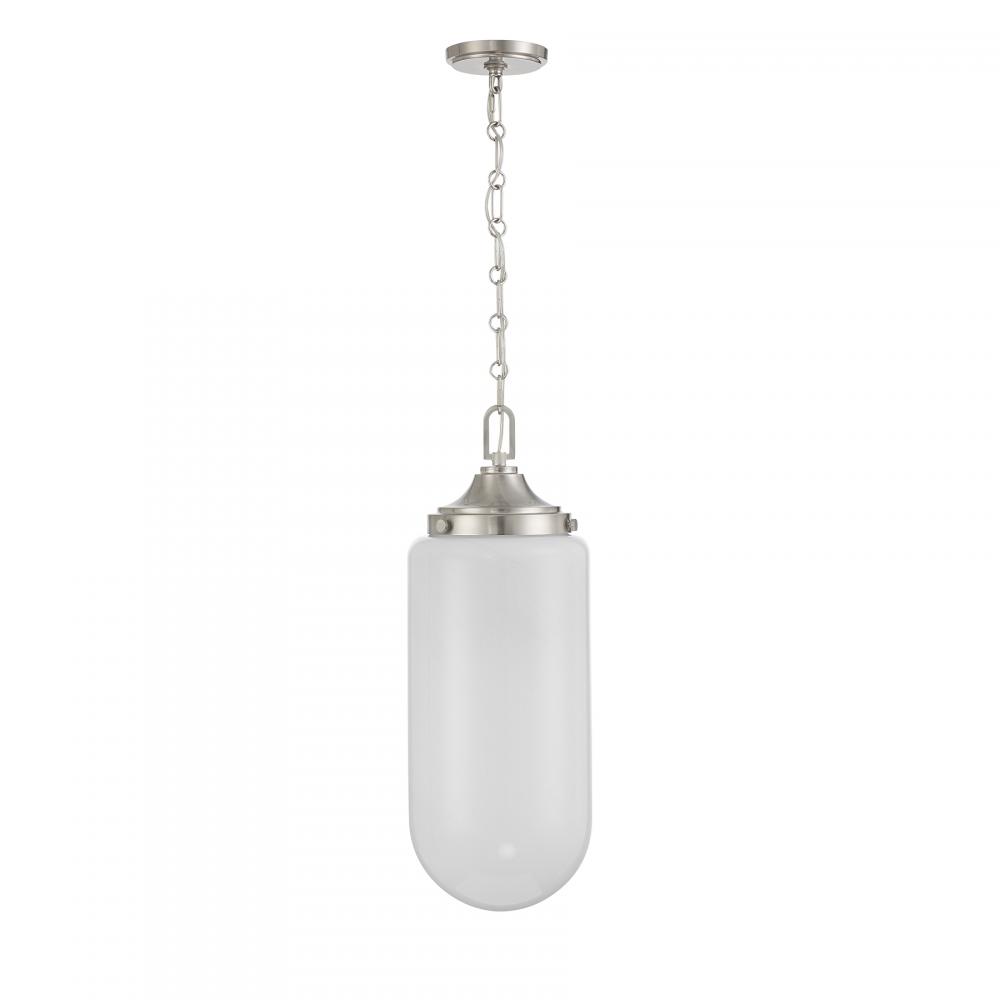 Decorate your space with the Savoy House Bryant 3-light pendant. Its understated structure allows the shade of beautiful, eye-catching strie glass to take center stage. This look is great when used solo or in groupings. Satin Nickel finish. 24.75" in height and 9" in width. Uses three standard size bulbs of up to 60 watts per bulb. Bulbs not included.