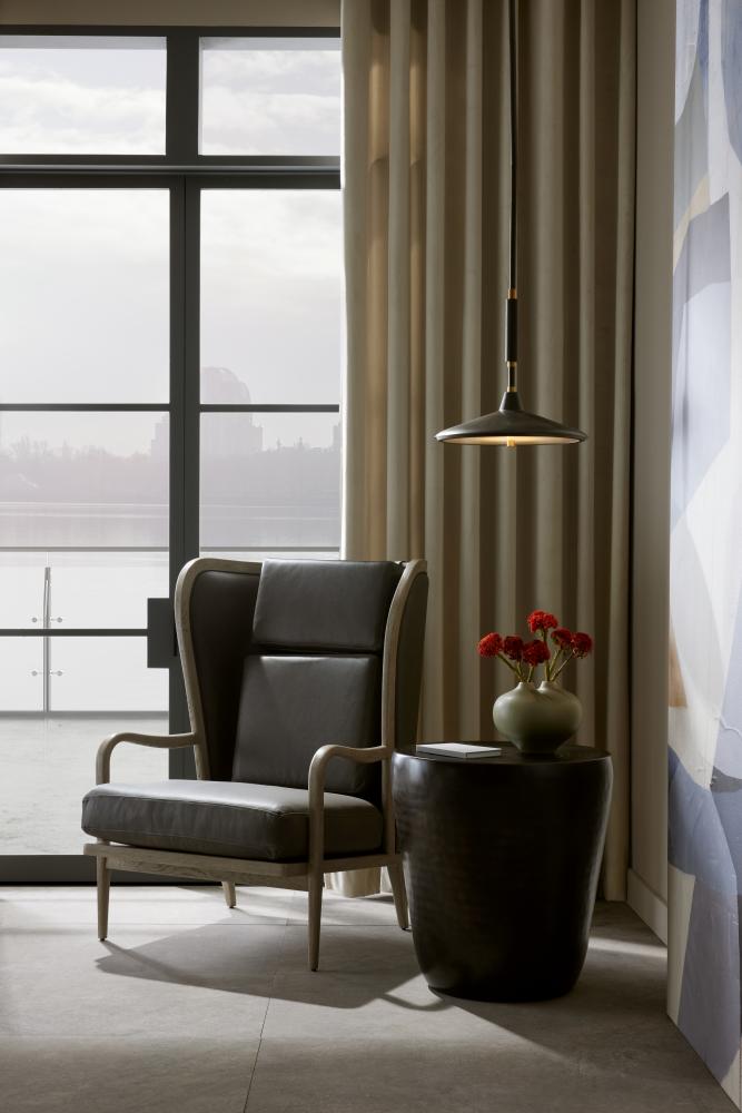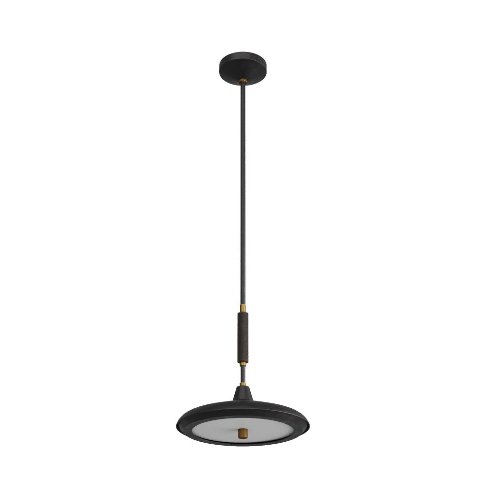 Crafted with an industrial aesthetic, this sleek flat shade in English bronze steel, is matched with a frosted acrylic diffuser, concealing an integrated LED. Accented with a structure in antique brass steel with etched antique brass details and finial. Damp-rated, although limited covered outdoor conditions may affect finish.