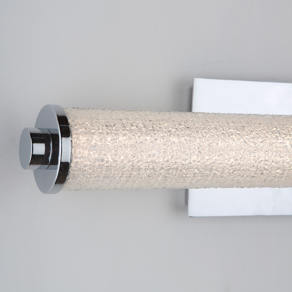 The "Buchanan" bathroom vanity collection features sparkling crystalline glassware that is illuminated by bright LED. The back plate and sides are plated in shiny chrome. Super energy efficient and fantastic color rendition (CRI 90). Delivered Lumens: 2185