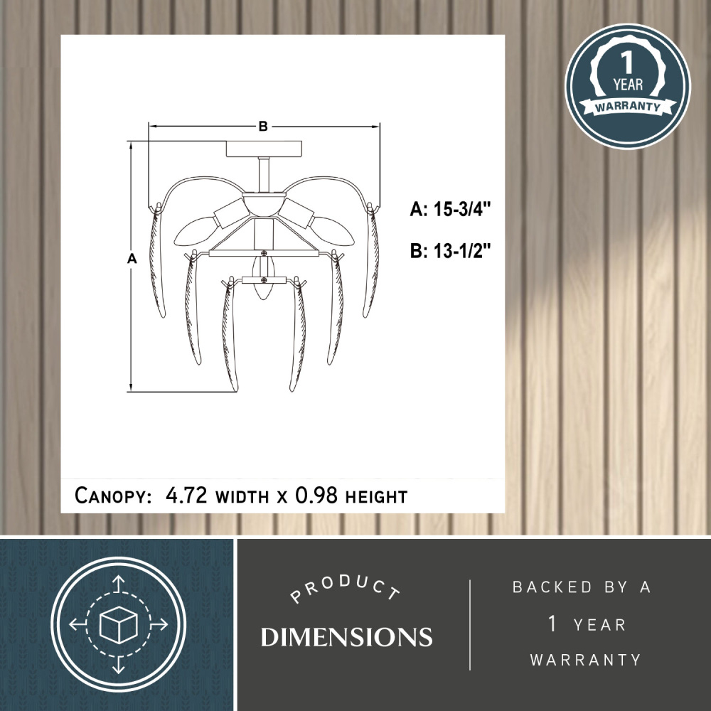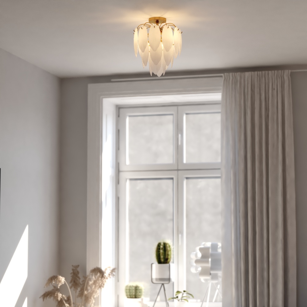 Channel the allure of the art deco era with the Burbank 4-light semi-flush mount in an elegant muted gold finish. The frosted, textured leaf glass creates a warm, inviting glow, showcasing high-quality craftsmanship with its substantial, sculptural design. This ceiling fixture's unique, hanging leaf motif adds a touch of vintage glamour, making it a stunning focal point in entryways, dining rooms, or living spaces. Embrace the timeless charm of art deco design and elevate your home's decor with the Burbank collection.