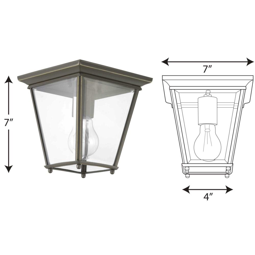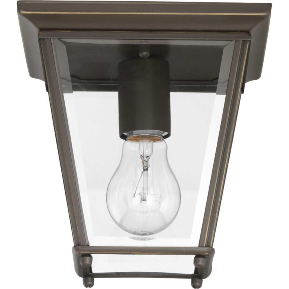 The Burlington collection flush mount finished in Antique Bronze fixture features an aluminum construction, weather-resistant performance with clear, beveled glass panels. Suitable for both indoor and outdoor applications, the open bottom design allows easy access to replace light bulbs.