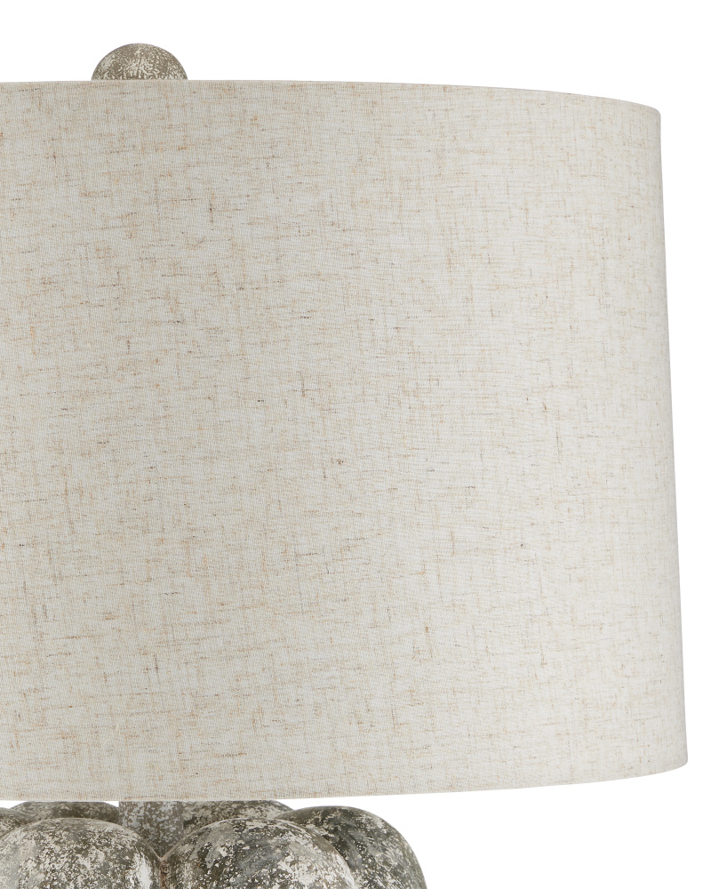 The Buttress Table Lamp is a rough luxe design made of composite in a mix of dark gray and textured white finishes to make it look like weathered concrete. The shape of the sections are reminiscent of lady fingers and the swelling of the lamp's body creates interest as it rises toward the subtly textured shade.