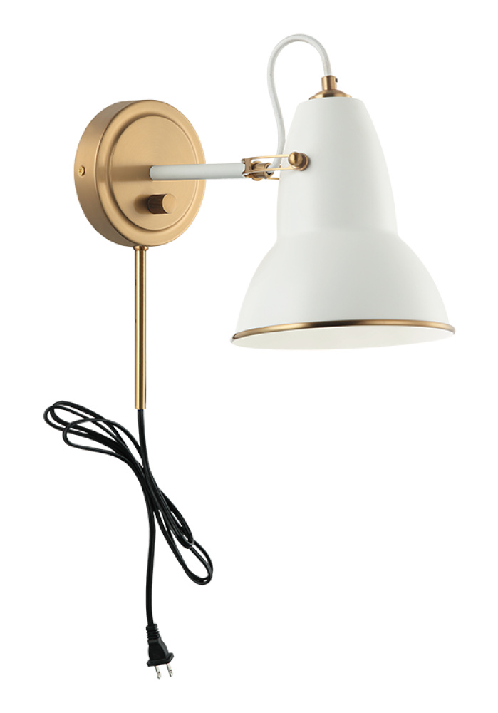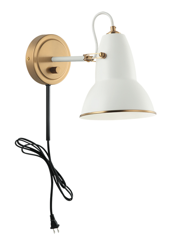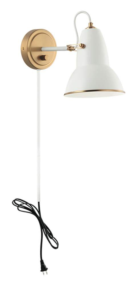 A playful yet sophisticated wall sconce collection. Designed with a dome shaped adjustable shade with Aged Gold Brass trim. This is extended with an adjustable arm. Features a built in dimmer, and available in 2 finish combinations and 2 sizes.
