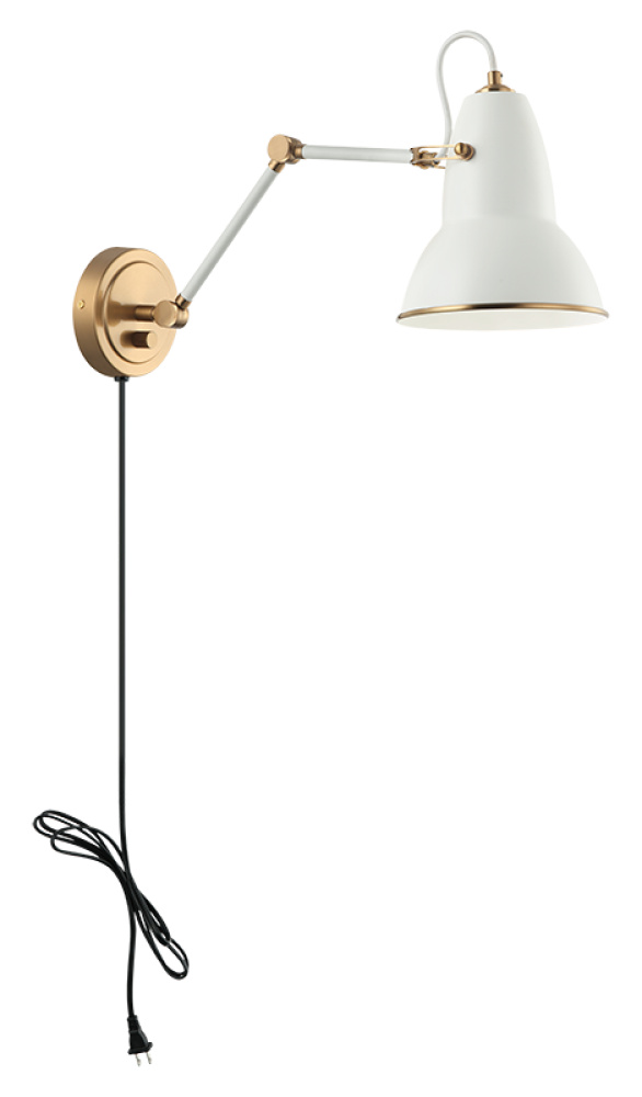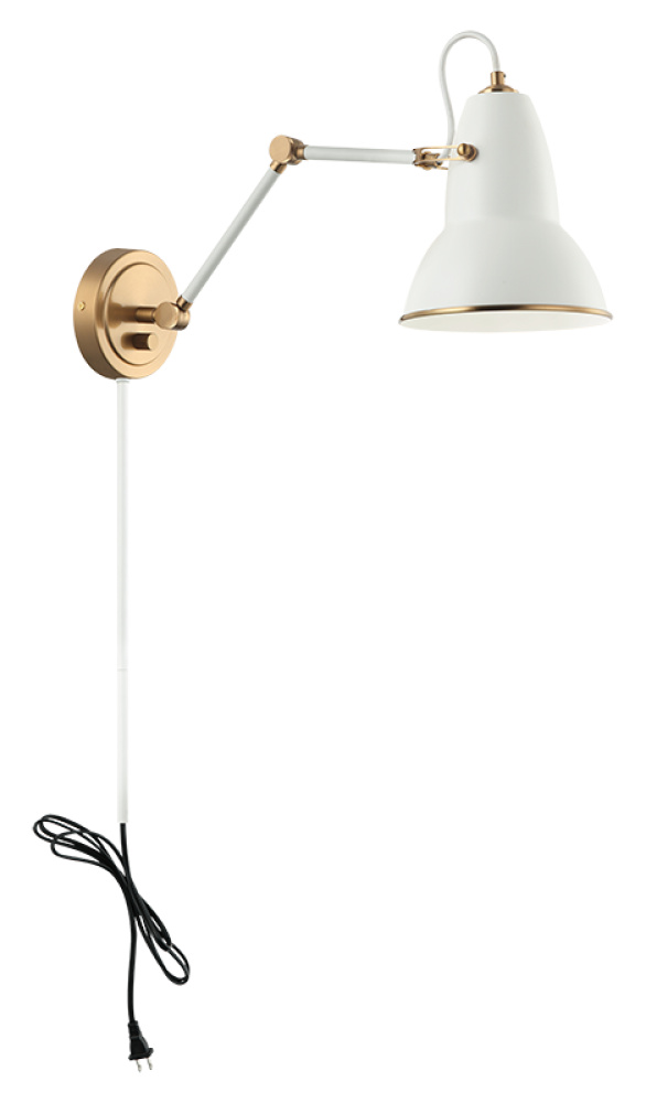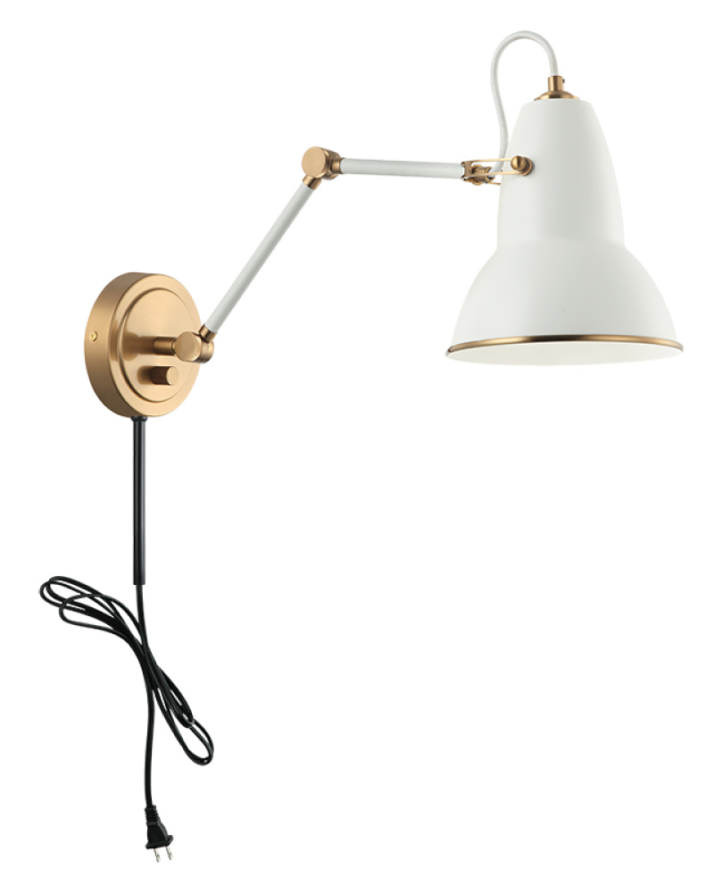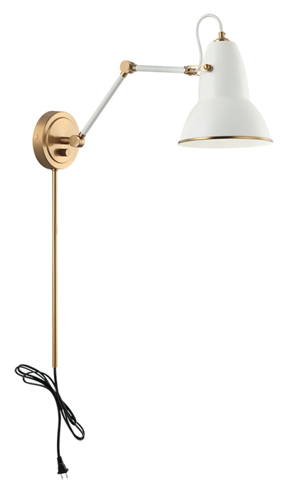 A playful yet sophisticated wall sconce collection. Designed with a dome shaped adjustable shade with Aged Gold Brass trim. This is extended with an adjustable arm. Features a built in dimmer, and available in 2 finish combinations and 2 sizes.