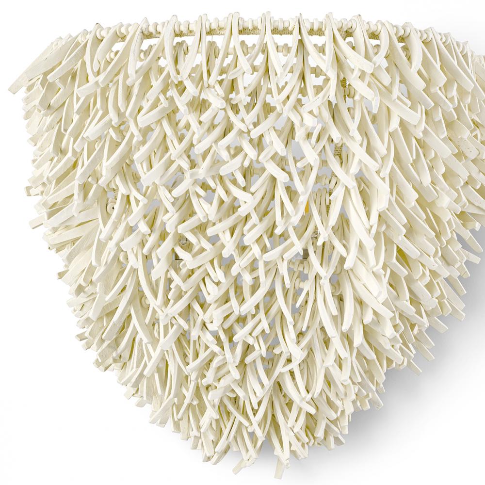 Hand-carved coco shells in a feathered shape with wood beads all in a cream finish sewn over a powder coated metal frame accented with finely woven white abaca rope details. Sconce comes with cream finished backplate. Professional installation recommended