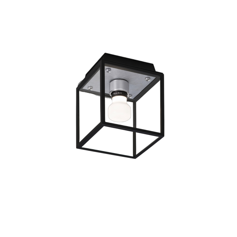 A ceiling light made from a matt black metal and glass cage, complete with a sand cast metal back panel. It features a solid metal, cross knurled, lampholder with our signature coin screws. IP44 rated and ADA compliant, suitable for wet locations*, bathroom and outside use. Available in Steel, Brass, Gun metal, Black + Steel, Black + Brass and Black + Gun Metal finishes. Protected against water splashed from all directions, with limited ingress. In some cases, moisture may get into the cage but will evaporate after a short time through drainage holes.