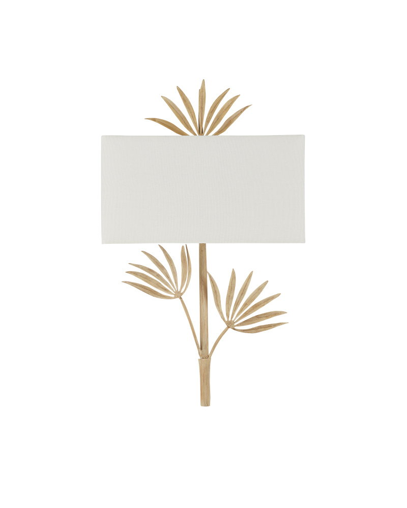 The Calliope Wall Sconce was inspired by the leaves of the bamboo plant. Though the stem and fronds of this tan wall sconce appear to be made of natural material, they are crafted from wrought iron with coco cream and ivory finishes, hand-applied by artisans. A notable design detail is the placement of the clean-lined rectangular shade—its thin profile makes this sconce ADA compliant.