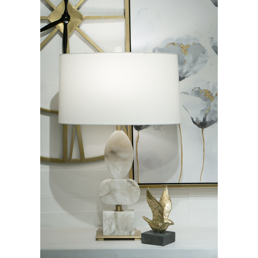 The Calmness Table Lamp adds poise and balance to an interior arrangement. Made from carved white marble stacked and held in place by a metal base, its soft natural pallet and high quality stone are paired with metal appointments in a luxe, champagne gold finish for an added touch of modern glam. Its graceful appeal is completed with an oval, hardback shade in white linen.
