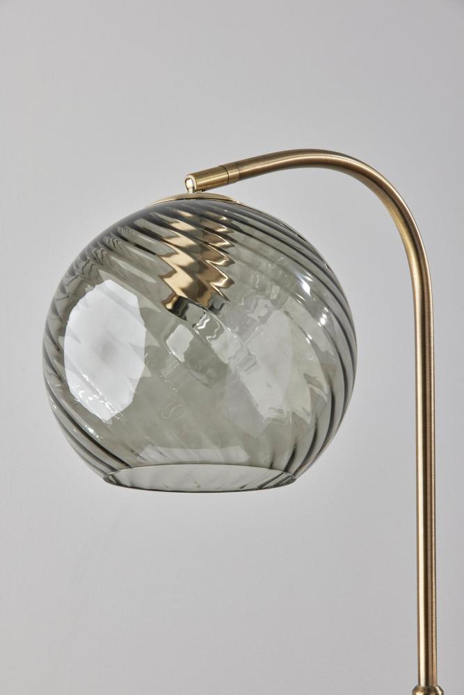 With a blend of contemporary and mid-century modern design elements, the Camden floor lamp imbues any space with warmth and light. A round base with an antique brass finish supports a matching tall tube and gently arcing stem. Suspended from the stem is a 9" diameter globe shade crafted of smoked glass with a delicate swirl pattern. The glass leaves the 60W bulb visible, making a vintage Edison bulb (not included) a striking choice. for added versatility, the base of the lamp shade features an articulation point, allowing you to redirect the shade for a variety of looks and lighting options. Complete your décor with the coordinating Camden flush mount ceiling light, pendant light, wall lamp, desk lamp, and arc lamp.