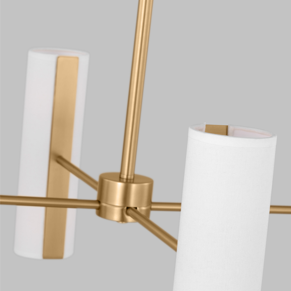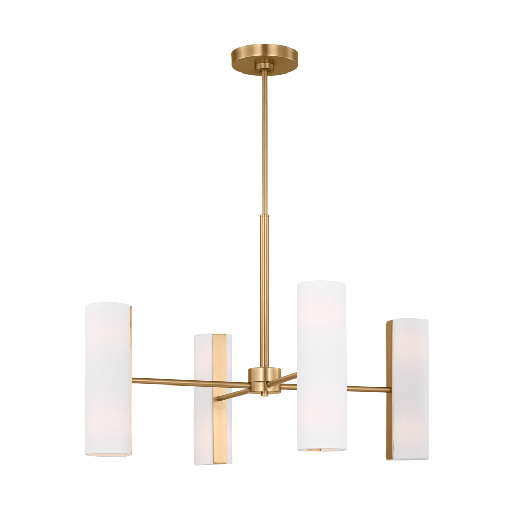Sleek and modern, this contemporary collection features cylindrical linen shades and a visible flat spine for a clean look. It features a candelabra-style fixture with four sleek arms referencing mid-century modern design. On the end of each arm, frosted glass shades direct soft light in both directions.