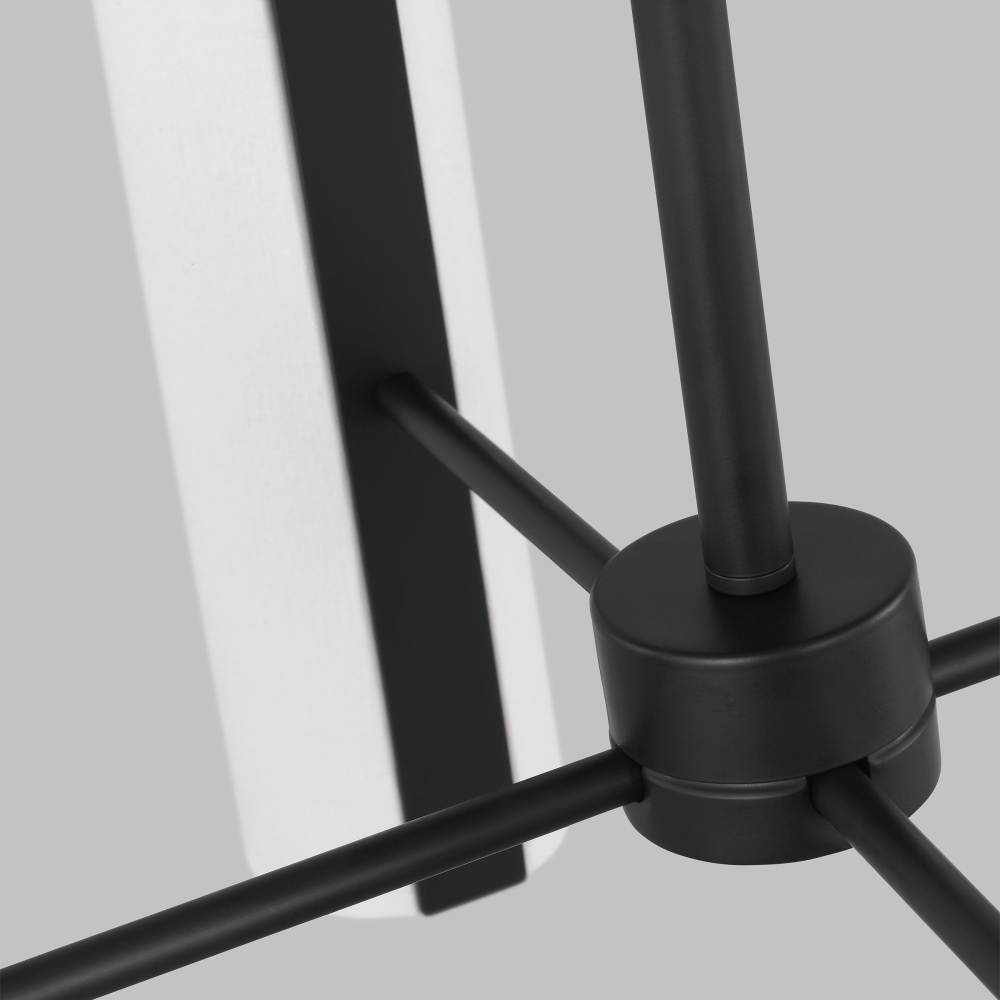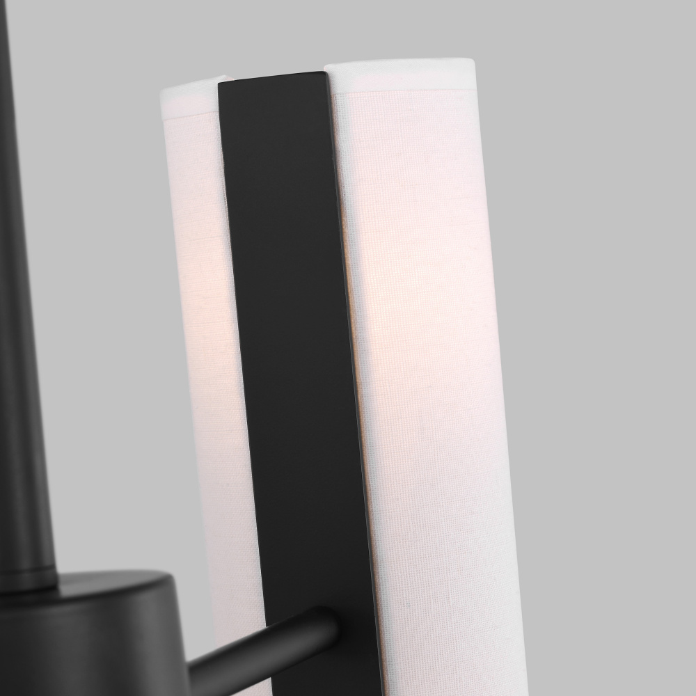 Sleek and modern, this contemporary collection features cylindrical linen shades and a visible flat spine for a clean look. It features a candelabra-style fixture with four sleek arms referencing mid-century modern design. On the end of each arm, frosted glass shades direct soft light in both directions.
