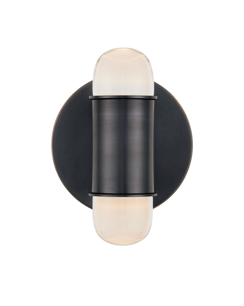 The Capsule Bronze Wall Sconce is a clever design that can be hung with the solid optic crystal shades facing vertically or horizontally. The black sconce is also technologically savvy, as it is fitted with an integrated LED. The oil-rubbed bronze metal is a nice contrast to the lightly frosted glass that glows when the lights are switched on. The sconce is rated for damp locations.