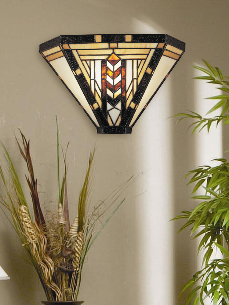 Our Carnelian wall sconce features all of the design elements of the popular mission style in a lovely three-sided shade. White art glass is accented with light and dark amber, yellow, brown and red in an intricate chevron pattern on the center stage. The dark filigree overlay provides an excellent contrast, which highlights the colors in the shade beautifully. A wonderful accent light choice for a den, study or office, Carnelian also makes a nice entryway or hallway lamp that will work well with any decor style for years to come.