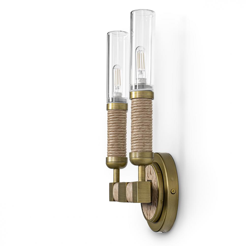 All-weather synthetic rattan hand-twisted and wrapped over brass-finished metal and backplate. Weave is resistant to cracking, peeling, fading and breaking. Sockets are enclosed in glass tube for protection from water. Suitable for outdoor use in a wet lo
