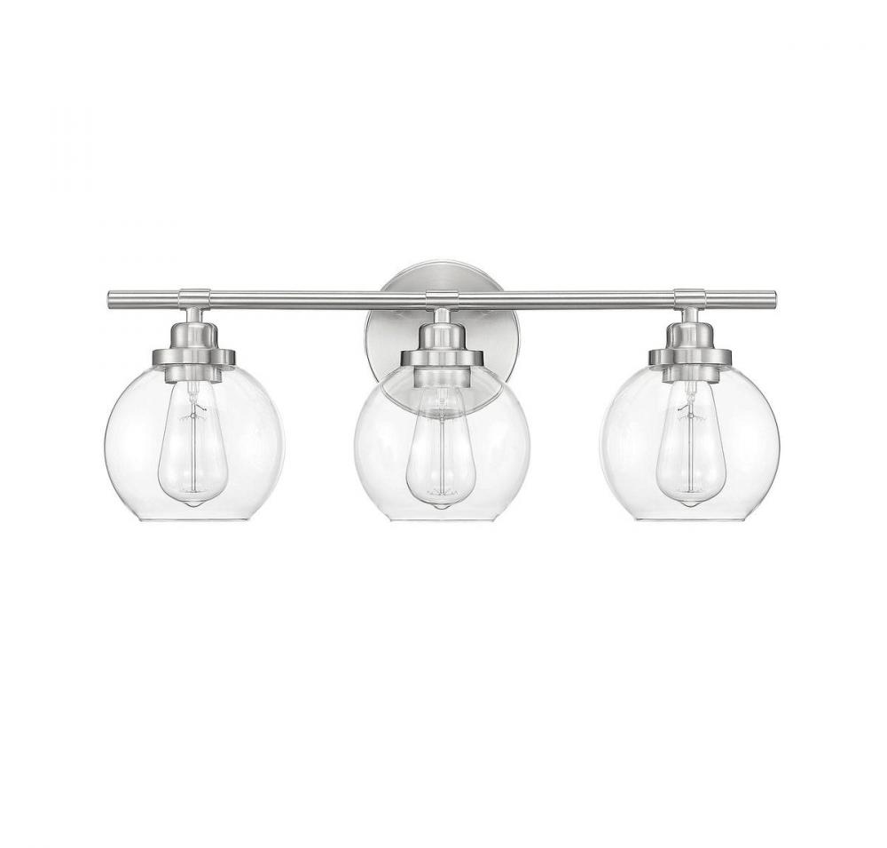 Adding the Savoy House Carson 3-light bath bar easily helps you boost the illumination and the style of any bathroom. Its fishbowl-style clear glass shadesmake a big statement and are open at the bottom, making it easy to replace the bulbs. The streamlined structure offers up subtle detailing with a mid-century modern vibe and the circular backplate echoes the shape of the glass shades. Finished in satin nickel. This fixture is 22.5" wide and 8.5" tall. It extends 7" from the wall. Uses 3 standard size bulbs of up to 60 watts each (not included).