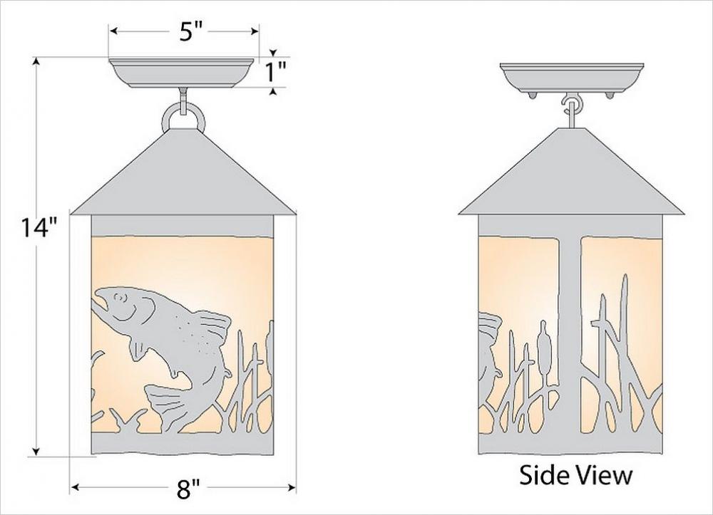 River Cabin style Close-to-Ceiling Lights handmade in USA by Avalanche Ranch Lighting. This light features our exclusive metal wildlife art of a Trout. This Ceiling Light is ideal for anyone looking to add rustic character or unique log home lighting to their home. Dimensions (inches): 14h x 8w and Takes 1 - Type A21 bulb - 150W max.