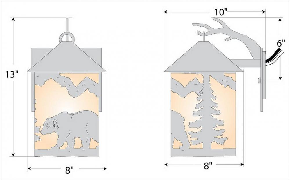 Cabin style Exterior Wall LIghts handmade in USA by Avalanche Ranch Lighting. This light features our exclusive metal wildlife art of a Bear. This Outdoor Wall Light is ideal for anyone looking to add rustic character or unique log home lighting to their home. Dimensions (inches): 14h x 8w and Takes 1 - Type A21 bulb - 150W max.