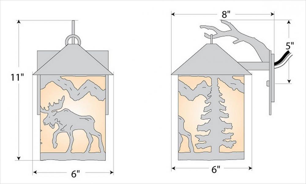 Rustic style Exterior Wall LIghts handmade in USA by Avalanche Ranch Lighting. This light features our exclusive metal wildlife art of a Moose. This Outdoor Wall Light is ideal for anyone looking to add rustic character or unique log home lighting to their home. Dimensions (inches): 12h x 6w and Takes 1 - Type A19 bulb - 100W max.