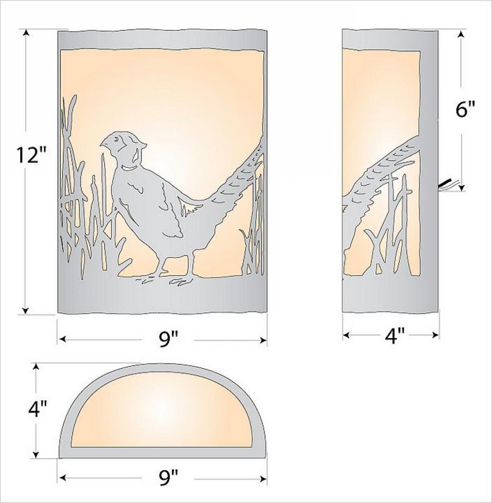 Lake Cabin style Interior Wall Sconces handmade in USA by Avalanche Ranch Lighting. This light features our exclusive metal wildlife art of a Pheasant. This Wall Light is ideal for anyone looking to add rustic character or unique log home lighting to their home. Dimensions (inches): 12h x 9w and Takes 2 - Type B11 bulbs - 60W max. each